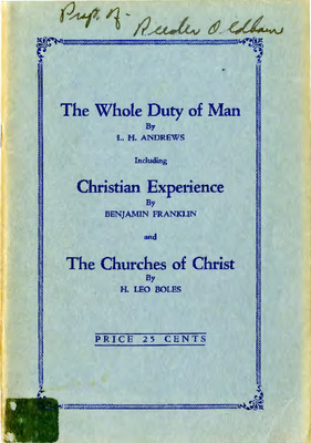 1950Full title includes: The Whole Duty of Man by L. H. Andrews, Including Christian Experience by Benjamin Franklin, and The Churches of Christ by H. Leo Boles